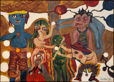 Soms is Lotti zelf te herkennen in haar composities, zoals in ‘L’enterrement d‘une sainte’ uit 1972. Geheel naakt, afgezien van een typische ‘oversized’ bril, wordt zij omringd door vier al dan niet goedaardige fantasiewezens. Alles in het schilderij lijkt in beweging, grenzeloos en vrij. Zij lijkt geen hinder te hebben van de sprookjesachtige figuren om haar heen. Er is sprake van ‘levendige spanning’, zoals kunstcriticus-museumdirecteur Bram Hammacher vele jaren eerder haar werk eens typeerde.